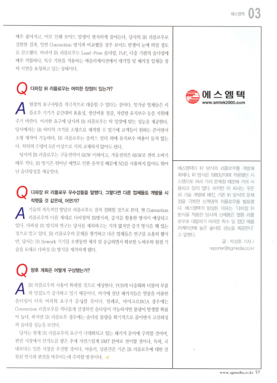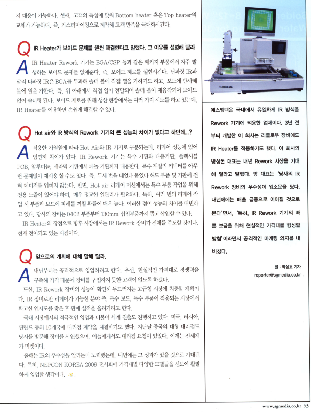 SMD와 수삽(삽입부품) 혼재 기판의 생산과 수리를 할 수 있는 Reflow 생산/Rework 겸용으로 사용할 수 있는 만능 장비를 개발할 수 있으며, 홍상어와 이외 어뢰와 미사일 메인 보드 수리용으로 리워크 장비를 국방과학연구소에 납품하여 사용 중입니다. 특히 우리의 자랑인 최첨단 전투기 KF-21 시리즈에 사용되는 레이더 생산과 개발 용도로 2중 용도로 개발 완료하여 판매를 재개합니다.